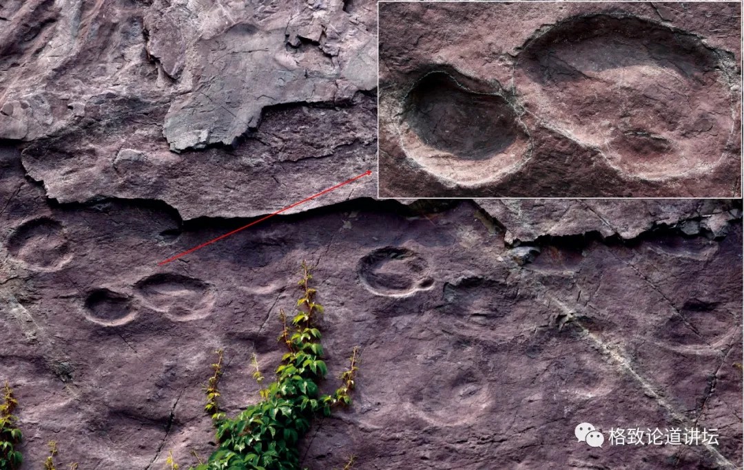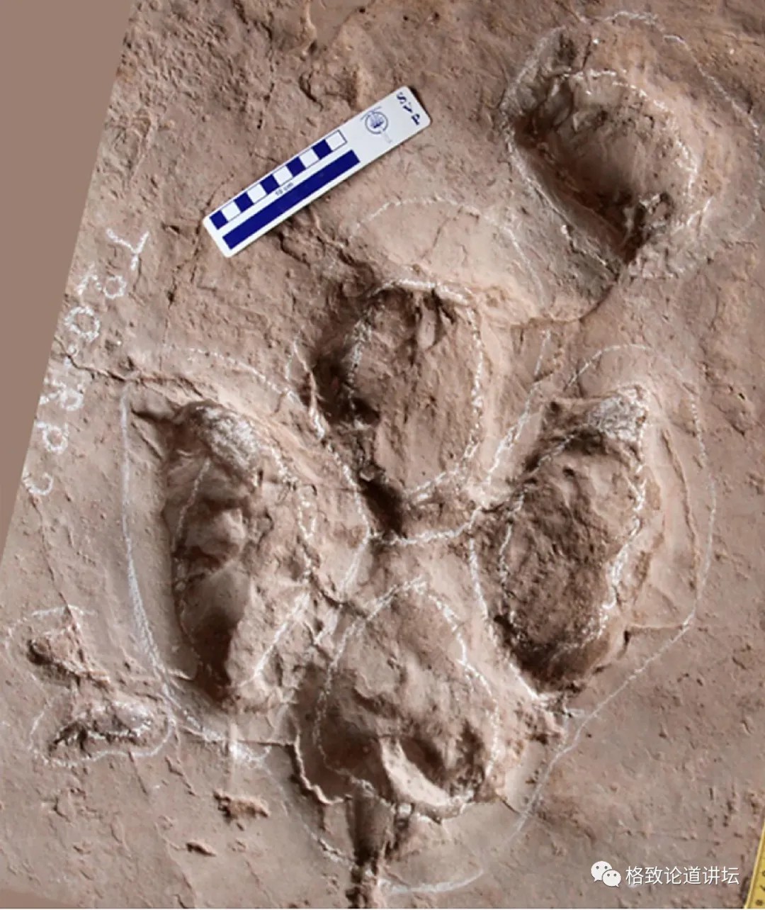 这个脚印跟刚才我们前面看到的脚印不一样。刚才是蜥脚类的恐龙脚印,而这个是兽脚类的恐龙脚印,它踩出的样子特别像鸡爪子,有三个趾头。经过我们研究,这是属于卡岩塔足迹,我们推测它的造迹者是中国龙。