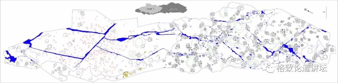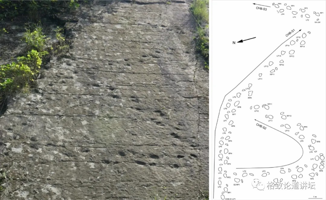 大家看到这张图,上面有一处明显的恐龙转弯的行迹。大家可能觉得恐龙走路转弯很正常,但是那个时候造山运动还没有开始,很难有什么东西来阻挡恐龙这么庞大的物种前进的脚步。我们在全世界发现的大量恐龙脚印都是直着的,很少有这种转弯的现象。