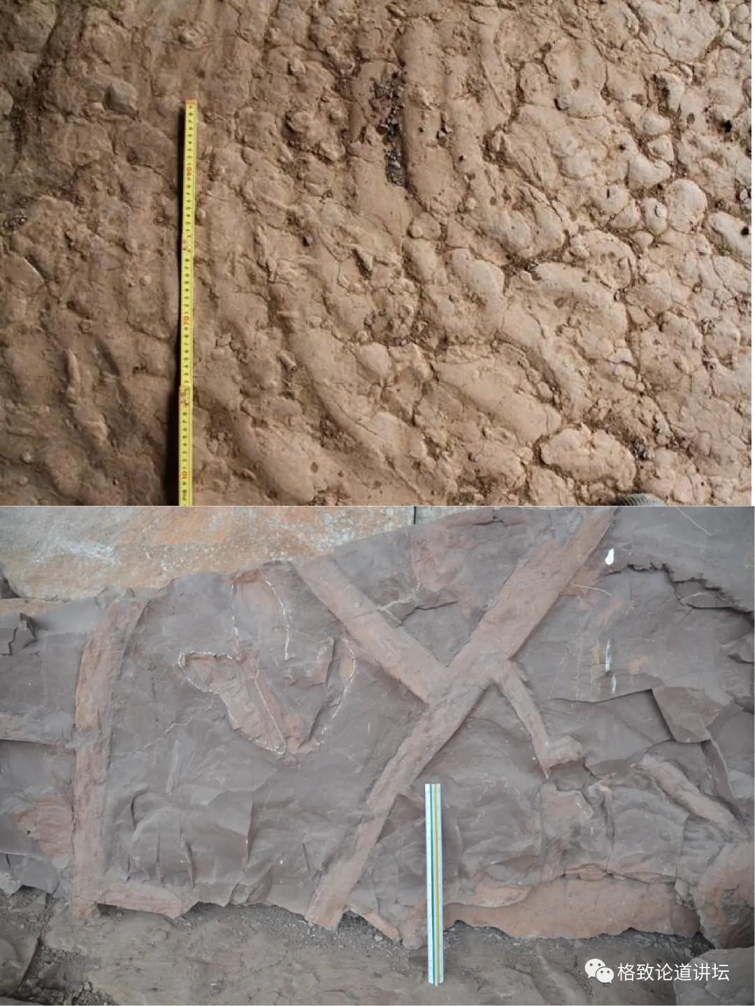 在莲花保寨的地面上有很多在我们地质学上叫做波痕,是由当时的水流形成一种地质构造。地面上还有泥裂。可能古人看到这些地质构造,会想到水流的环境。