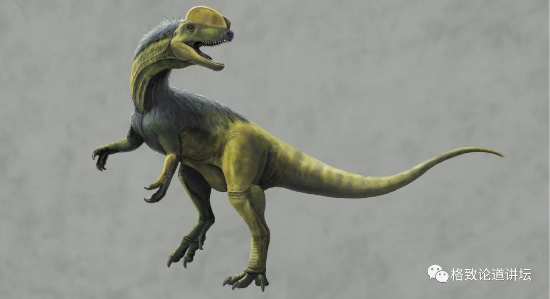 中国龙是怎样一个形态呢?它头上有两个冠。我介绍到这个特征的时候,可能有很多同学就知道它属于什么龙类了——双脊龙类。我们中国最有代表性的一个双脊龙,就是中国龙,它踩的脚印就是这样三趾的形态。