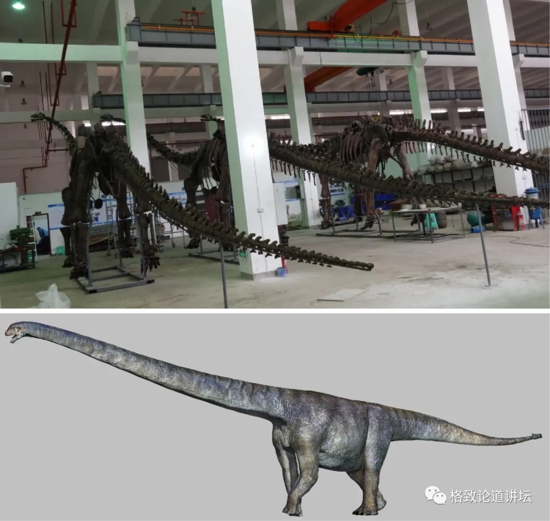后来我们把它复原装架,一个长24米的马门溪龙在我们面前出现了。这是目前重庆装架最大的恐龙化石。