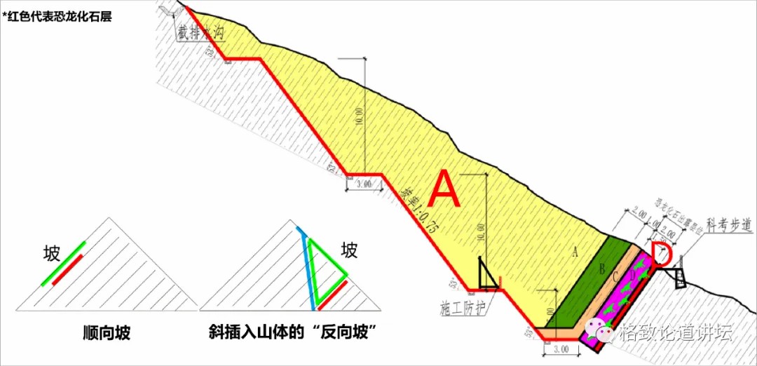 发现后,我们向自然资源部申请发掘工作。恐龙化石埋藏在地层中,地层是什么样子的?就跟书本一样是一层一层的,我们想把这个恐龙化石发掘出来,就必须把盖层剥掉。地层经过亿万年的地壳运动,很多恐龙化石是被深埋在地下的,云阳就是这样的情况。这里的恐龙化石是埋得非常的深,因为地壳运动使这儿的地层倒立起来了,只有一个断面露出来。所以我们想把这个恐龙化石,就是图上右下侧这个红色的面,把它揭出来。