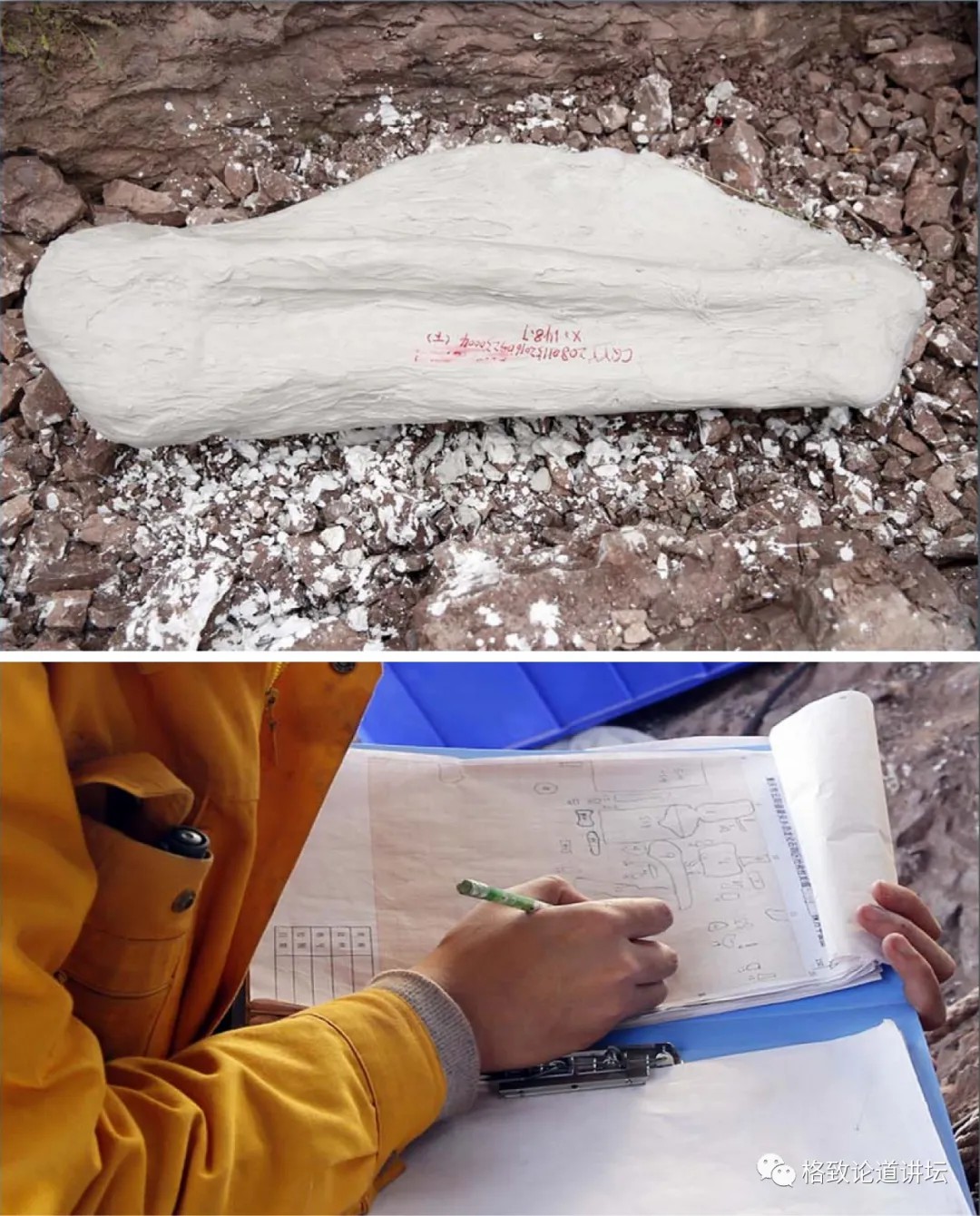 发掘到入化石层后,我们会给化石记录信息,还有布置探方以及打皮劳克,还有画埋藏图等等。皮劳克是什么呢?就是一层石膏、一层纱布给化石打包,跟骨折了在医院里打的石膏很像。