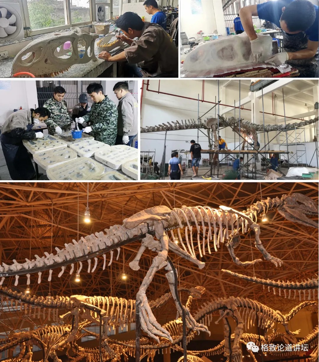 但如果要把这些恐龙化石放到博物馆进行展示,它还会经历化石的复原以及模具制作、模型制作以及装架的设计,最后组合装架成我们在博物馆看到的这些恐龙化石骨架。