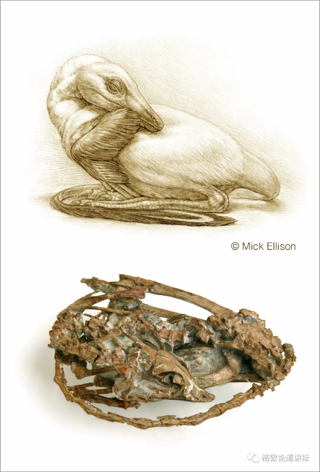 这张图是我的老师徐星当时发现的一只正在睡觉的恐龙。大家看恐龙的姿态,就是把它的头藏在翅膀底下正在睡觉的一个姿态。所以我老师当时给它取了一个名字叫寐龙,也就是睡觉的龙,是当时全世界名字最简单的恐龙。