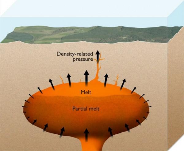 研究人员发现,这实际上足以引发一次火山喷发,迫使岩浆库顶部破碎,一直到达地表(如图所示)。但是,科学家指出,这通常会引起灾难性的岩浆库崩塌(在一次超级火山爆发中释放所有的岩浆),还是引发更小的压力—缓解喷发,目前还不清楚。研究人员希望,更多地了解这些火山的触发机制,未来或能提高对危险火山爆发的预测能力。