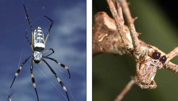 左为金丝圆蛛,右为鬼面蛛。雄蛛化石的发现促使科学家怀疑此前的判断,即这种史前蜘蛛来自于络新妇属家族。络新妇属雄蛛的体型远不及雌蛛,但新发现的史前雄蛛并不比雌蛛小多少,说明来自于另一个家族。科学家表示这种史前蜘蛛与现代鬼面蛛更为相似