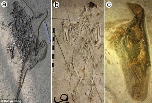中国东北地区热河生物群发现一处考古遗址,完好保存着大量白垩纪早期动物尸体化石,图A是鹦鹉龙化石,图B和C是类似乌鸦的始祖鸟。科学家认为造成大量生物死亡的原因是火山喷发。