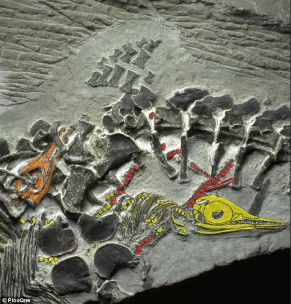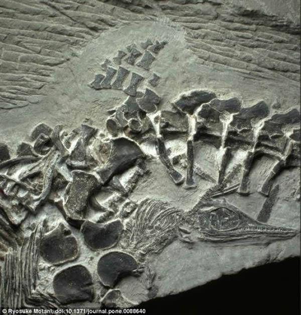 这具化石被认为是在生育过程中丧生的最早的远古海洋爬行动物的一个鲜活实例。它的部分骨骼是在中国安徽挖出的,在母亲的肚子里有一条还未出世的小鱼龙胎儿,另一条已经有一半身体从骨盆里露出来,还有一半仍留在母亲的肚子里,而第三条小鱼龙已经完全脱离母体