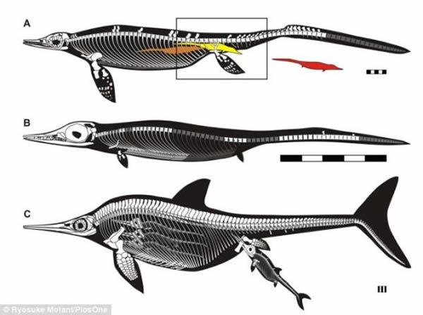 这张图片显示的是与鱼龙亚纲(B)作对比的成年巢湖龙及其胚胎的复原图。长方形显示了新生儿是如何脱离A的身体的。C图中的巢湖龙显示,有1个胎儿即将诞生,另有3个胎儿仍处于母体的腹腔中
