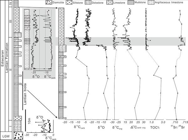 中国科学院南京地质古生物研究所王伟博士和周传明研究员等人通过对皖南石盂剖面埃迪卡拉系蓝田组碳酸盐岩的碳(无机碳和有机碳)、氧、锶同位素和微量元素等其他地球化学指标的高分辨率分析,发现该剖面蓝田组碳酸盐岩记录了埃迪卡拉纪中期碳同位素强烈的负漂移事件。更加引人注目的是,紧接着碳同位素漂移事件之后,碳酸盐岩的氧同位素发生了剧烈的负漂移(最低值达到−26.7‰, VPDB),锶同位素比值(87Sr/86Sr)也发生了显著的升高。王伟博士等将极低的氧同位素值解释为冰川融水的信号,表明碳酸盐岩沉积于冰川融水(或与海水的混合水体)环境,从而证实该时期发生了冰川作用。碳酸盐岩中锶同位素值(87Sr/86Sr)的显著升高也与冰期时陆源风化作用的明显加强相一致。