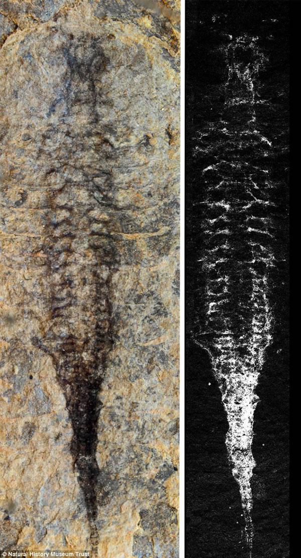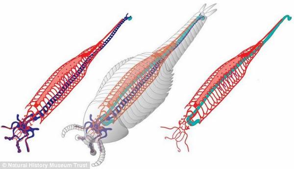 澄江动物化石群中节肢动物抚仙湖虫的背视,显示完整的心血管循环系统。