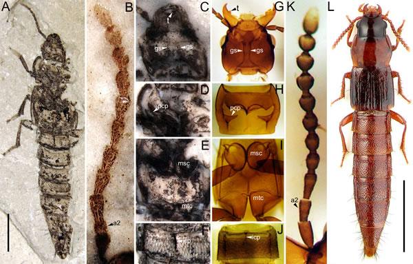 化石光滑隐翅虫与其现生代表的形态对比(化石网配图)