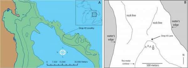 (化石网)据EurekAlert!:一项研究发现,位于休伦湖下的一个山脉上的岩石结构展现出了9000多年前有组织的季节性狩猎驯鹿的可能的证据。休伦湖的Alpena-Amberley山脉如今沉没在水中,它在9000年前提供了密歇根湖和安大略湖之间的一个干燥的陆地桥。