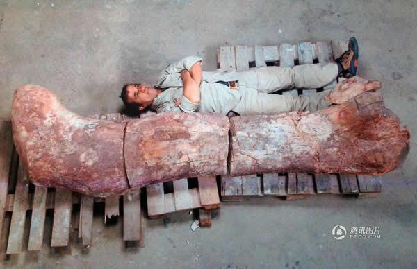 恐龙体长40米,高达20米。图为考古学家迭戈·波尔躺在化石旁边。