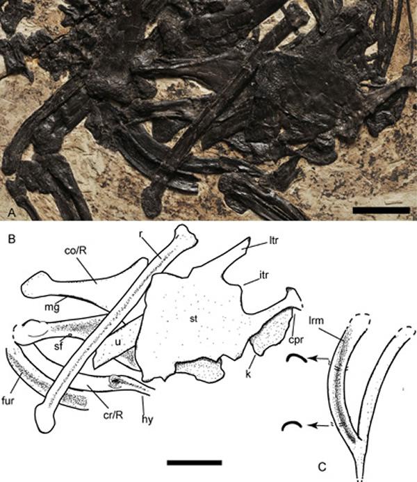 肖台子强壮爪鸟(Fortunguavis xiaotaizicus)肩带复原(王敏供图)
