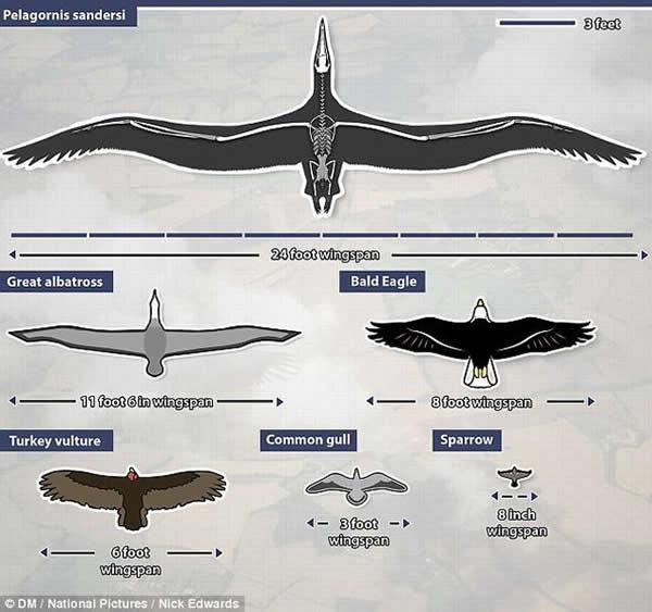 美国达勒姆国家进化综合中心的丹尼尔·克塞普卡在美国《国家科学院学报》上报告说,这种海鸟平均翼展为6.4米左右,超过了此前的纪录保持者——早已灭绝的阿根廷巨鹰,而且是现存地球上最大鸟类皇家信天翁翼展的两倍。