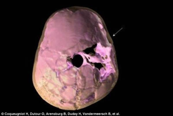 法国国家科学研究院的工作人员通过数字成像技术和三维重建技术,对自以色列卡夫泽洞穴(Qafzeh Cave)的孩童头骨碎片进行了还原,发现死者头部曾受过强烈的外部撞击。据推测,死者的年龄为12至13岁。