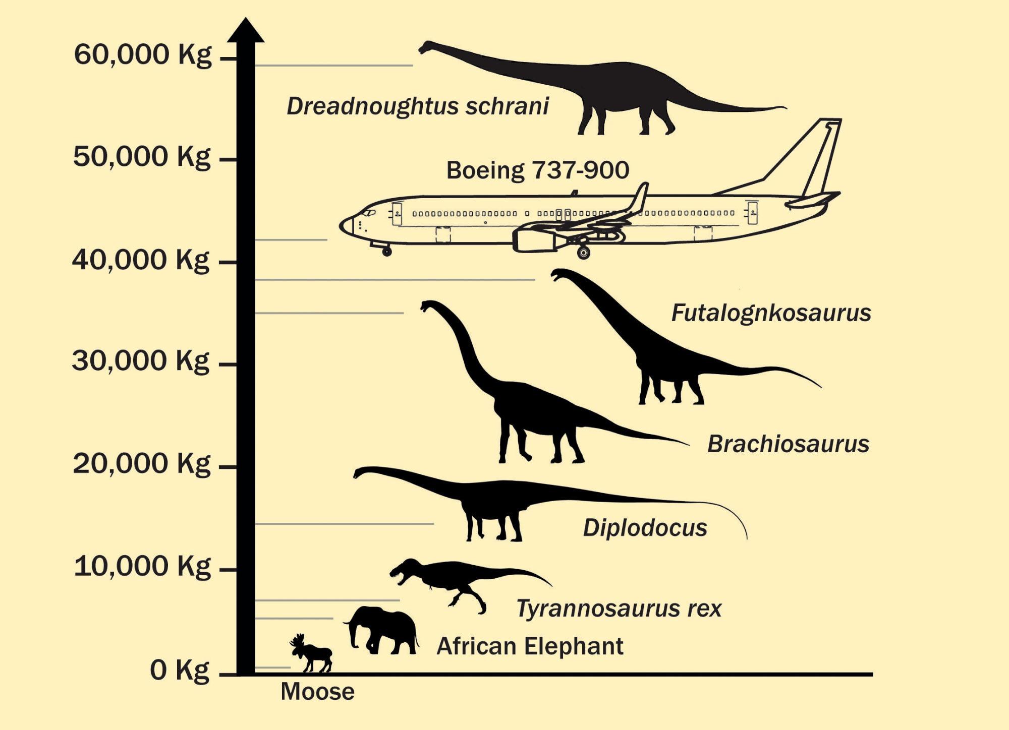 通过对Dreadnoughtus的骨骼进行测量,并利用其近亲的比例估算其他丢失骨骼的长度,Lacovara及其同事推断,Dreadnoughtus从鼻子到尾部的伸展长度大约是26米。通过测量肱骨和股骨(前肢和后肢的上部骨骼)的周长—这是估算四足动物体重的一个公认的黄金标准,研究人员认为,较大的一具Dreadnoughtus标本在其死亡时体重达到59.3吨。