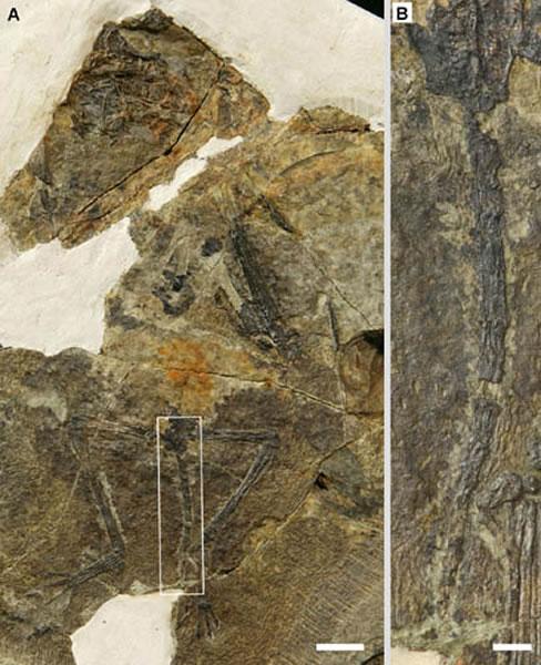 蛙嘴翼龙化石(A)及尾部放大(B),比例尺为10 mm和2 mm