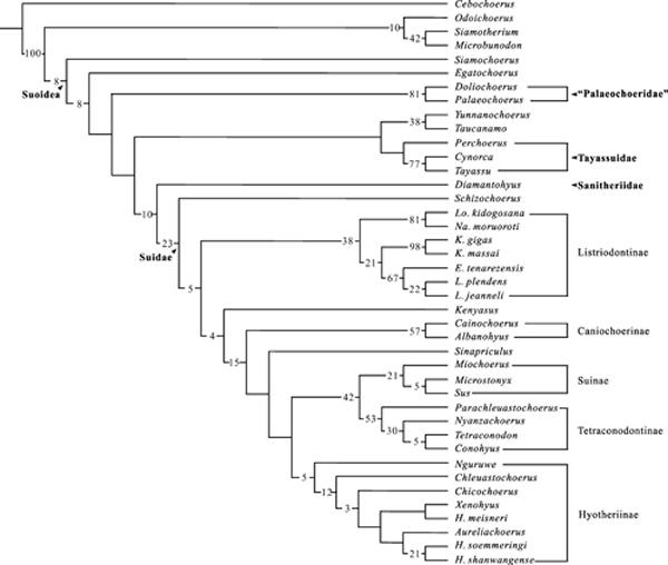 弓颌猪的头骨既保留了较多渐新世-早中新世猪超科的原始特征,同时又发育一些在猪亚科中较常见的进步特征,导致其系统分类位置存在很多争议,既有人将之归入较为原始的猪兽亚科(Hyotheriinae),也有人将之归入了猪亚科(Suinae)。研究人员在传统的形态对比的基础上,结合支序系统学方法,对弓颌猪的演化位置进行了新的讨论。研究人员选取了猪形亚目的41个属种共计133个性状进行了系统发育分析,最终结果支持将弓颌猪属归入猪兽亚科,且位于该亚科比较基干的位置。