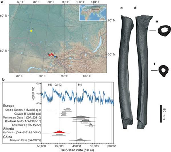 2008年,俄罗斯的一个名为Nikolai Peristov的艺术家在西伯利亚西部沿额尔齐斯河(Irtysh)寻找象牙时, 在Ust'-Ishim 附近发现了一块从河岸凸露出来的几近完整的人类股骨,经C14测年,确定为距今约4.5万年,是目前在非洲和中亚之外有直接测年数据的最早的早期现代人化石。通过最新的古DNA技术,实现了对该个体全基因組达到42倍的高通量測序,其数据质量可与现代基因组相媲美。从线粒体、Y染色体及核DNA多种分析来看,他所代表的群体相较于非洲人而言,更接近欧亚大陆群体,但看不出与某一具体亚洲、欧洲或北亚古群体更接近。换而言之,其所属群体与欧亚大陆的共同祖先同祖。之前,相关遗传研究认为,早期现代人扩散时走的是南线,最早进入南部大洋洲,再走入亚洲。然而,该项研究没有发现该西伯利亚个体所属群体相较于其他地区的现代人更接近大洋洲人群。该研究在一定程度上表明早期现代人走出非洲并非仅仅只有南部大洋洲路线,呈现更复杂的局面。该成果丰富了人类演化的细节知识。