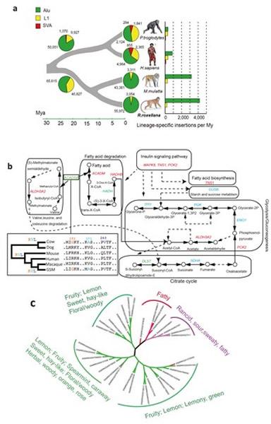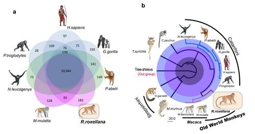 利用新获得的基因组数据分析发现,与人以及类人猿等基因组相比,旧大陆猴的基因组可能更加“动态”,并存在着较多的重组以及转座事件。而在植食性适应方面,这一类群可能采取两种策略,即一方面通过基因复制和扩张来消除植物次生代谢产物的毒性,而另一方面与脂肪酸和能量代谢相关的基因则受到正选择作用,有利于其发酵代谢以及高海拔适应。有趣的是,尽管金丝猴的嗅觉基因中有61.7%为假基因(这可能与金丝猴萎缩的外鼻孔以及嗅觉系统退化相关),但在其与牛的基因组比较分析中却发现33个快速进化的嗅觉基因,且大部分这些嗅觉基因(69.7%)可能参与感知水果、植物等气味相关,这一比例高于其他相关的物种;利用基因组数据,这次研究还首次对与植食性紧密相关的RNASE1基因的复制区域进行界定,针对RNASE1的序列比较及功能实验结果支持“一次复制假说”,即该基因复制发生在亚洲叶猴和非洲叶猴分歧之前;同时结果也支持“平行进化假说”,并证实第39位氨基酸由碱性向非碱性的转变可能是导致其最适pH值降低的关键。