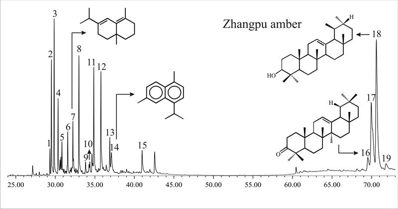 我国河南西峡和福建漳浦都具有悠久的琥珀开采历史,其琥珀原料一直作为一味重要的中药,因此具有重要的经济价值。但迄今尚未有研究关注西峡琥珀和漳浦琥珀的植物来源。 近期南京古生物所史恭乐博士、王博博士与印度理工大学孟买校区以及中国科学院西双版纳热带植物园等单位紧密合作,用气相色谱-质谱法测定了我国晚白垩世西峡琥珀和中中新世漳浦琥珀的萜类化合物组成。萜类化合物组成显示,晚白垩世西峡琥珀最有可能来源于裸子植物南洋杉科,但不能排除掌鳞杉科的可能性;中中新世漳浦琥珀最有可能来源于热带被子植物类群龙脑香科。此前在漳浦产出琥珀的地层中已发现了大量龙脑香科的翅果和叶化石,这与漳浦琥珀生物标志物研究得到了相互印证。