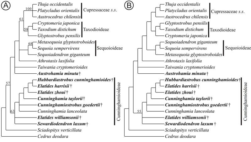 最近,南京古生物所史恭乐博士与美国、蒙古、日本和德国的同行组成的“蒙古白垩纪植物”研究团队系统研究并整体重建了产自蒙古国早白垩世的化石新种“周氏似纵(Elatides zhoui sp. nov.)”。化石材料为三维立体保存,栩栩如生,球果,雄球花和营养枝叶直接相连,形态上与现生杉木非常类似。化石新种以古植物学家周志炎院士的姓氏命名。研究选取22组形态特征,对包括柏科现生种和早期柏科化石种在内的22个类群进行了分支系统分析。分支分析分别采用了完全基于形态学数据的传统方法,和以分子系统发育树为骨架的分子骨架法(Molecular Scaffold)。结果显示,侏罗纪和白垩纪类似杉木的化石类群和现生杉木共同构成一个单系类群,这一单系类群位于柏科系统树的最基部,与现生柏科的其他类群构成姊妹群。