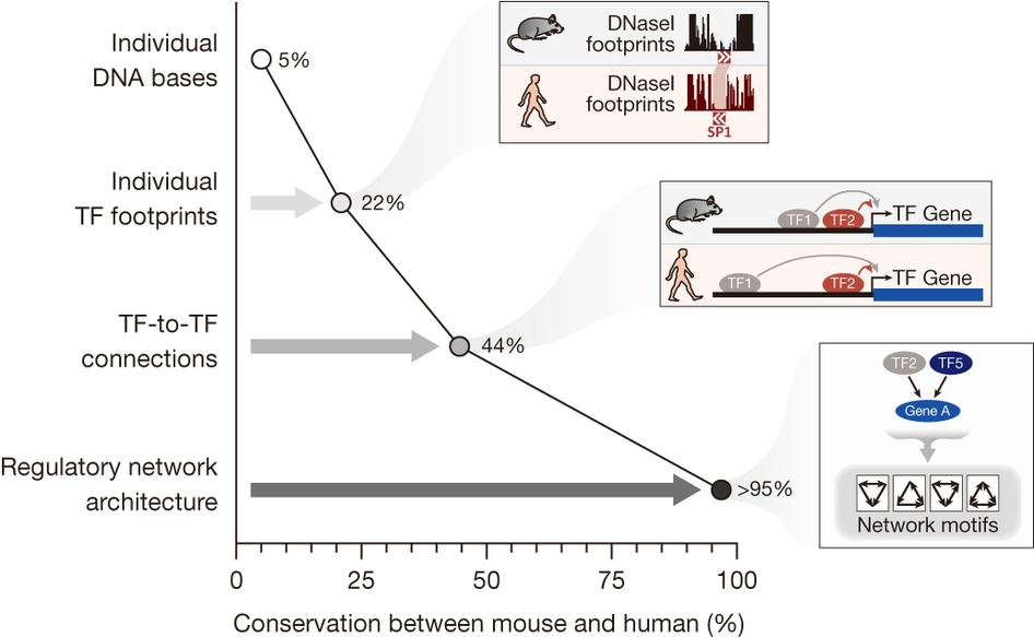 在此提出的数据集将对尝试理解哺乳动物调控DNA是如何演化的研究人员有用。有关哺乳动物中数千个基因是如何通过像增强子和启动子(它们控制着基因表达)等DNA成分进行调控的研究因为缺乏可在人与小鼠间进行比较的来自不同细胞类型的详细的调控DNA图而一直受到限制。