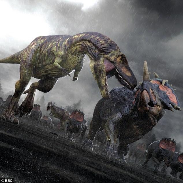 最新研究表明,小行星碰撞地球之前现今欧洲境内曾存活着大量恐龙,如图所示,这是艺术家描绘的白垩纪时期惧龙(左侧掠食者)正在攻击一群刺角龙。