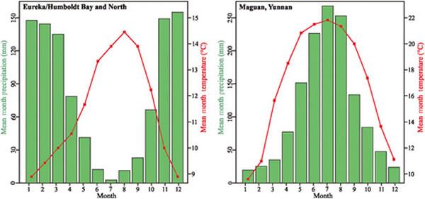 加利福尼亚北美红杉生长地和云南马关气候特征的比较