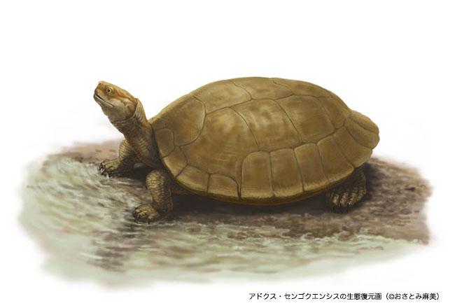 1.2亿年前阿杜库斯龟属新种“千石峡阿杜库斯龟”生态复原图(图片:日本福井县立恐龙博物馆 画・おさとみ麻美)(化石网配图)