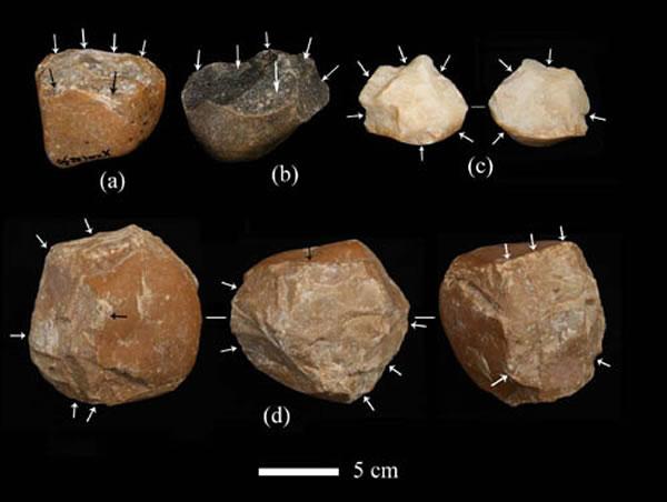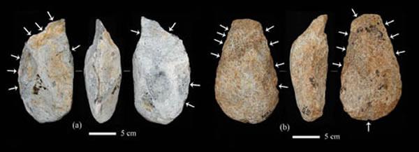 对于原生地层出土石制品,研究者采用西方技术类型学研究体系,通过对原料利用、石制品类型及个体大小、剥片类和工具、废片类型与技术以及修理技术等相关指标的统计分析表明,该遗址出土的剥片类产品均属于奥杜威工业(Oldowan)石核或石核工具类型,各种类型的废片显示原始的技术指标,但遗址出土2件两面器可分别归入西方阿舍利传统的手斧和薄刃斧,但修型较粗糙、对称性较低。综合来看,该遗址的石器工业特点可界定为中国(东亚)似阿舍利(Acheulean-like)或者mode2技术传统。