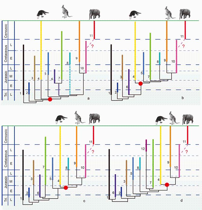 哺乳动物系统发育的不同假说。a–c 四种不同的哺乳动物系统发育假说。图中红点代表各假说中哺乳动物的节点位置,图中虚线和问号表示有胎盘类起源时间的不确定。1 非哺乳犬齿兽类;2 Sinodonodon 以及morganucodontids;3 Docodonta;4 Australosphenidans;5 Eutriconodontans;6 ‘Haramiyidans’;7 Multituberculates;8 ‘Symmetrodontans’;9 Metatherians (Marsupials);10 Stem eutherians;11 Placentals;12 Gondwanatheria。