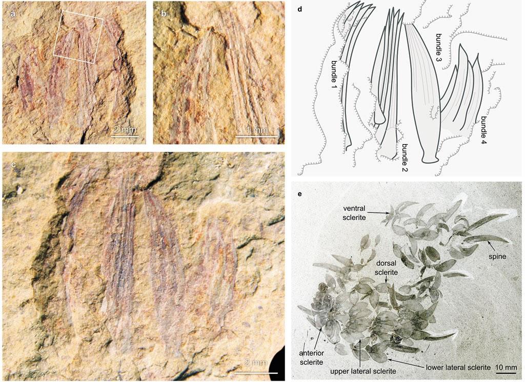 澄江生物群中Wiwaxia骨片化石(a-b)与布尔吉斯页岩动物群中Wiwaxia骨片(e)对比