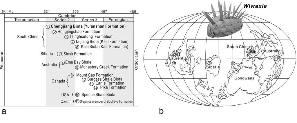Wiwaxia化石的地层分布 (a)和地理分布(b)