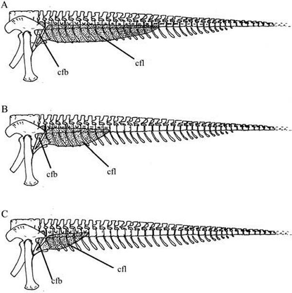L.M. Ibiricu等人发现,基干巨龙类有着最长的尾股长肌(CFL),其从臀部一直延伸到尾巴长度的一半。而萨尔塔龙亚科(Saltasaurinae)的尾股长肌则最短,非萨尔塔龙亚科的岩盔龙类(Lithostrotia)的尾股长肌长度则介于二者之间。