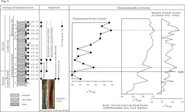 最近,该课题组与中国科学院广州地化所贾国东研究员合作开展了我国深海相SDB的研究,主要通过采用化学地层学手段(主要对样品进行有机碳碳稳定同位素、有机碳总量变化等指标的测试与对比分析)并结合笔石化石新材料的发现,开展了广西玉林地区长湾塘剖面中SDB的综合研究,为我国深海相SDB的研究提供了可靠的依据。研究结果表明:在玉林长湾塘剖面中的SDB位置位于样品CY-29与CY-30之间,即防城组顶部。这与在该剖面样品CY-29中发现的早泥盆世笔石标准化石Monograptus uniformis及M. aequabilis的首现相一致。该项研究不仅为我国志留系/泥盆系界线以及界线附近海相与非海相地层的全球对比、高精度年代地层框架的完善或建立提供了可靠的依据和支持,而且进一步推动了当前国际上志留系/泥盆系界线地层学的研究。相关成果今天在国际SCI刊物Estonian Journal of Earth Sciences公开发表。