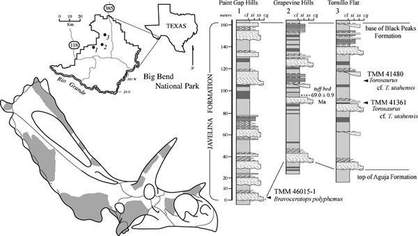 (化石网/兽王 编译)美国大弯曲国家公园的Steven L. Wick和德克萨斯州理工大学地球科学系的Thomas M. Lehman在德国《Naturwissenschaften》杂志的最新一期上发表了一件研究报告,这件研究报告描述了角龙科(Ceratopsidae)开角龙亚科(Chasmosaurinae)一个新属新种——波吕斐摩斯布拉沃角龙(Bravoceratops polyphemus)。