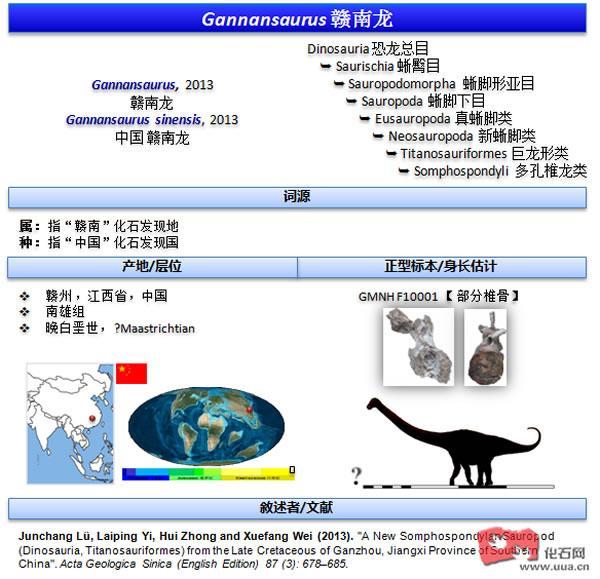 (化石网/兽王 编译)中国地质科学院地质研究所的吕君昌等人在2013年第三期的《地质学报英文版(Acta Geologica Sinica (English Edition))》杂志上发表了一篇题为《中国南部江西省赣州市晚白垩世一个新的多孔椎龙类蜥脚次亚目恐龙(恐龙超目,巨龙形类)(A New Somphospondylan Sauropod (Dinosauria, Titanosauriformes) from the Late Cretaceous of Ganzhou, Jiangxi Province of Southern China)》的研究报告,这篇研究报告命名了蜥脚次亚目(Sauropoda)巨龙形类(Titanosauriformes)多孔椎龙类(Somphospondyli)恐龙一个新属新种——中国赣南龙(Gannansaurus sinensis gen. et sp. nov.)。