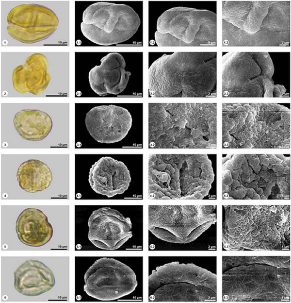 植物化石孢粉的照片1, 2, 3, 4. Quercus. 5, 6. Cyclobalanopsis.