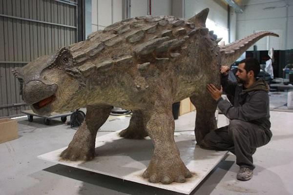 接下来,就要用陶土制作一个缩小的恐龙模型,作为之后复原工作的参考。制作“真实”大小恐龙所选取的材料取决于模型的用处。如果用来展览,那么展览厅的灯光也需要放入选材的考虑因素中。“因为欧洲盾龙长约五米,我们就选取了一种最轻的材料来制作它的模型,为了能够让模型支撑起全部的重量。”欧洲盾龙的模型是用一种聚乙烯材料制成的,每块盾形骨骼的组成部分都是一块一块地测量制作出来的,眼睛是用玻璃制成,是由一家德国公司特制的。