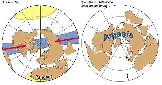 地球的各大陆正在缓慢靠拢(左)。大约在5000万年后到2亿年内,将会形成一个新的超大陆--美亚大陆。2012年的研究表明,新的超大陆中心位于北极。