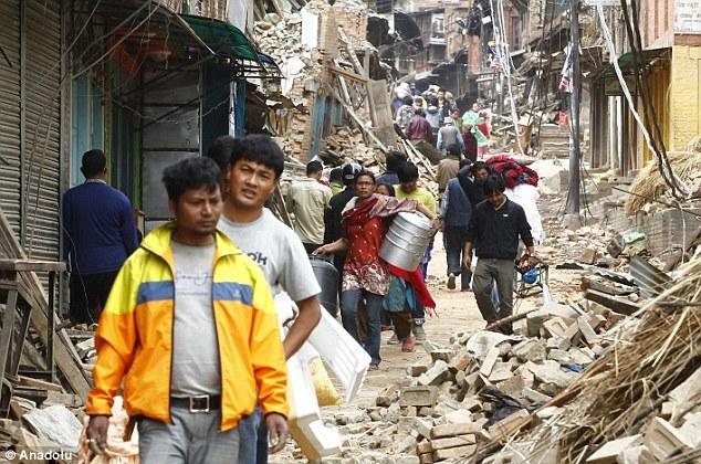 研究人员认为,尼泊尔地震表明构造板块的漂移究竟有多危险。本图显示,尼泊尔灾民走在废墟上。