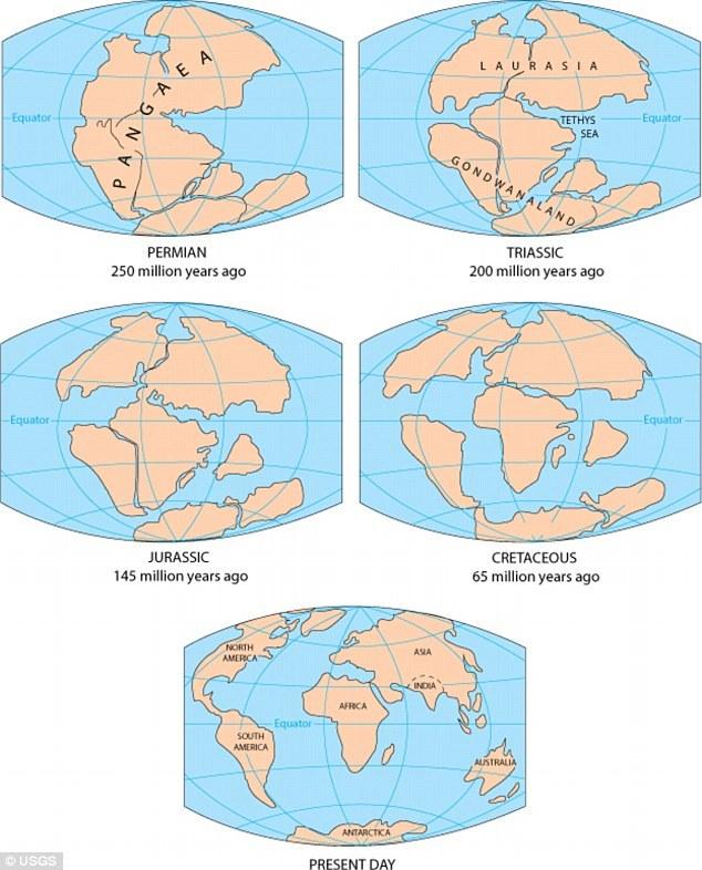 这组图显示了盘古超大陆是如何分离形成如今的几个大洲的。