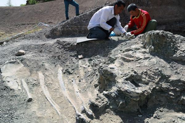(化石网报道)据人民网沈阳5月6日电(陈扶宜):辽宁朝阳北票大板镇孤家子村哑巴沟组发现生活在早白垩世距今1.26亿年前大型蜥脚类恐龙化石。目前,辽宁省化石资源保护管理局工作人员正在进行抢救性挖掘。