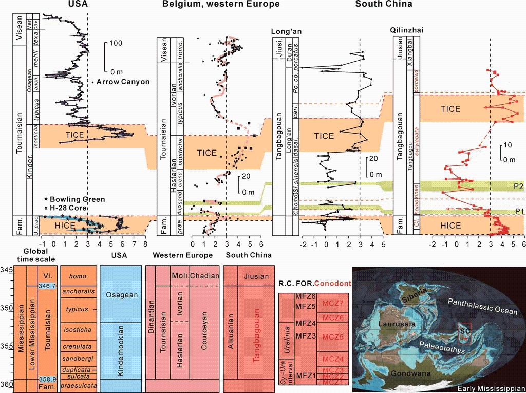 为解决这一科学问题,南京古生物所郄文昆副研究员、王向东研究员与中国地质大学(武汉)、江苏省地质调查研究院和美国Texas A&M University等单位合作,对汤耙沟组次层型剖面的牙形刺生物群和碳同位素记录进行详细研究,建立了高精度牙形刺生物地层和碳同位素地层格架,自下而上共识别出7个牙形刺生物带和4次明显的碳同位素正向偏移事件。研究结果表明:1)黔南地区汤耙沟组为一穿时岩石地层单位,在其次层型剖面,汤耙沟组代表了泥盆纪末期牙形刺Upper Siphonodella praesulcata 带至石炭纪杜内期晚期Scaliognathus anchoralis-latus 带中部地层;2)华南浅水相区泥盆系-石炭系界线位于牙形刺Polygnahtus spicatus带底部附近,泥盆纪末碳同位素正向偏移事件(HICE)之后的负向偏移区内;3)汤耙沟组中部的碳同位素正偏事件(TICE)在欧美地区可以得到很好的对比,其偏移幅度和极值范围表明华南地区碳同位素记录反映的是全球海洋碳同位素值变化,而非局部碳循环影响;4)运用牙形刺生物地层和碳同位素地层综合研究方法,可以实现区域和全球范围内杜内阶地层的精细对比。