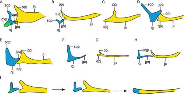 据研究人员介绍,颧骨和方颧骨来自不同的骨化中心,在现生鸟类胚胎期,二者就已经完全愈合成一棒状骨骼,构成眼眶的下缘。而在鸟类的近亲恐龙中,颧骨和方颧骨并不愈合,颧骨后端分叉形成眶后骨突和方颧骨突,而方颧骨则为“T”型,分别向前、向背侧、向后伸出颧骨突、鳞状骨突和腹后侧突。在恐龙中,颧骨的眶后骨突与眶后骨关节,从而将眼眶与下颞窝完全隔开;方颧骨的鳞状骨突与鳞骨关节,构成下颞窝封闭的后缘。相较恐龙,现生鸟类头骨发生了巨大的改变,尤其是眼眶的后部——眶后骨退化,颧骨——眶后骨关节、方颧骨——鳞状骨关节丢失等,这些改变使得鸟类能够通过方骨在前后方向上的活动,推动腭部的骨骼向前向后,最终使得嘴巴能够相对于脑袋进行抬升或下降,完成取食活动。