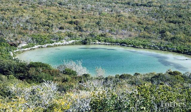 位于巴哈马圣萨尔瓦多内陆的一个“蓝洞”天坑,化石可以在这些坑洞中被完好地保存数千年时间。(图片来源:维基百科/詹姆斯·圣约翰,通过CC-BY 2.0协议授权)